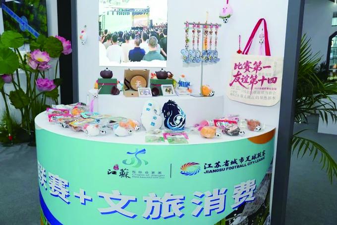 今年江苏省城市足球联赛火爆出圈,“苏超”主题展位带来各地热销文创产品,“比赛第一,友谊第十四”帆布袋、13个设区市文化IP毛绒挂件、淮安“浪里马”摆件、连云港东海水晶手链、无锡宜兴紫砂足球套装等,吸引众多游客纷至沓来。“苏超起烽烟,狼哥驰绿茵,十三太保起刀兵,谁问鼎?战衣汗洒滴,呐喊声声起,白马银枪飘然的你,在哪里?寻寻觅觅……”浸染着苏州评弹温润韵味的《声声慢·苏超情缘》在场内流转,带领观众沉浸式领略江苏独一无二的“水韵”魅力。